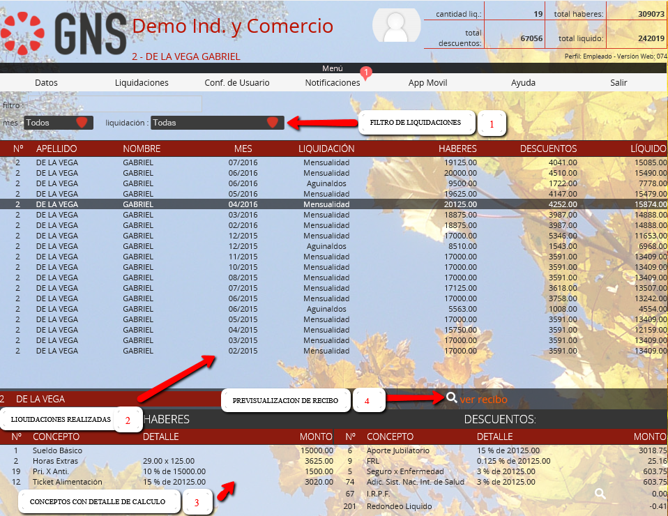 • 4 ->Ver Recibo: Al hacer un click sobre el boton que dice Ver Recibo podremos previsualizar el recibo de la liquidacion. Igual al que nos brinda la empresa.